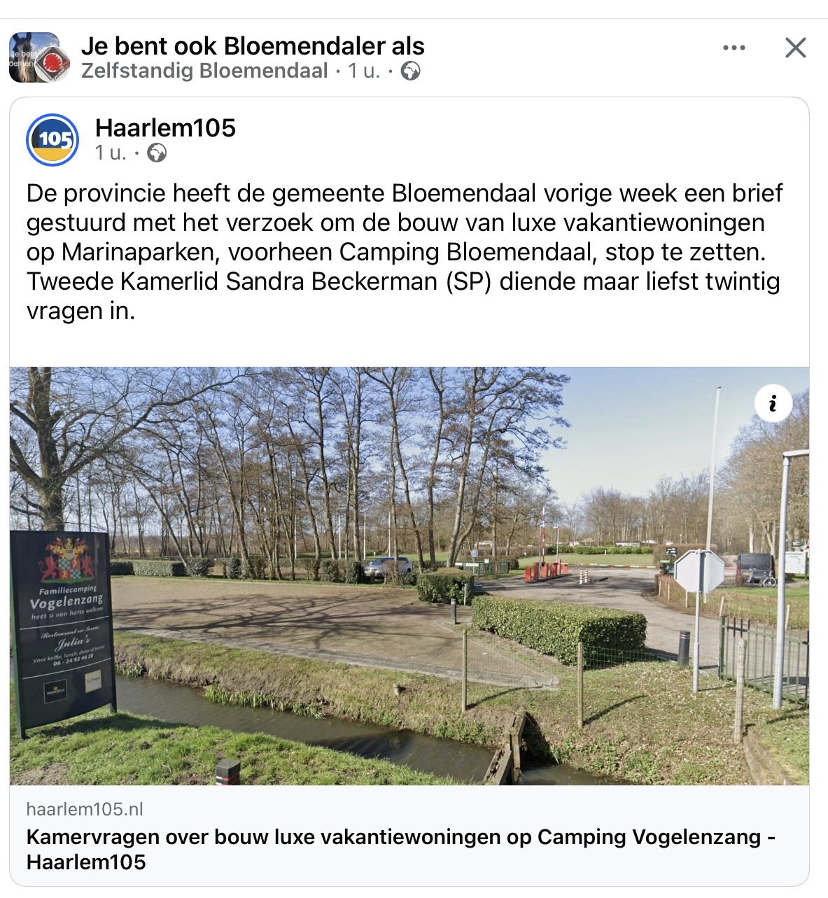 D66 VVD CDA en Hart voor Bloemendaal stemmen tegen onze motie voor een gezamenlijke juridische aanpak tussen provincie en gemeente tegen de bouw van 350 luxe vakantiewoningen op camping Vogelenzang. Onvoorstelbaar dat deze partijen nu al de handdoek in de ring gooien. Wat kan er nu op tegen zijn om in overleg te gaan met de provincie ? Vanwege eerdere gemaakte fouten in het dossier ? Als je echt tegen deze ontwikkeling bent dan ga je in overleg met de provincie die ongetwijfeld zich juridisch goed voorbereid heeft.